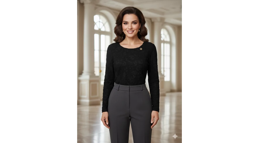 Mystic Day Henrietta felső Nőies, finoman áttetsző felső Várgmintás Kerek nyakú Áttetsző anyag 3/4-es ujjak Tethezálló szabás Rugalmas anyag |