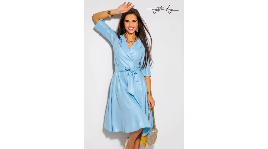 Mystic Day Lucia ruha Elegáns és nőies , világoskék midi ruha Selymes fényű anyagának köszönhetően különleges ,ünnepi megjelenést biztosít Átlapolt mellrész, v kivágott Galléros 3/4-es ujjak Derékban szabott, övvel Lefelé bővülő fazon |
