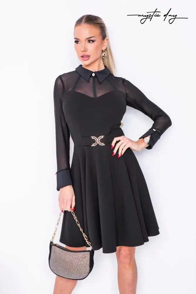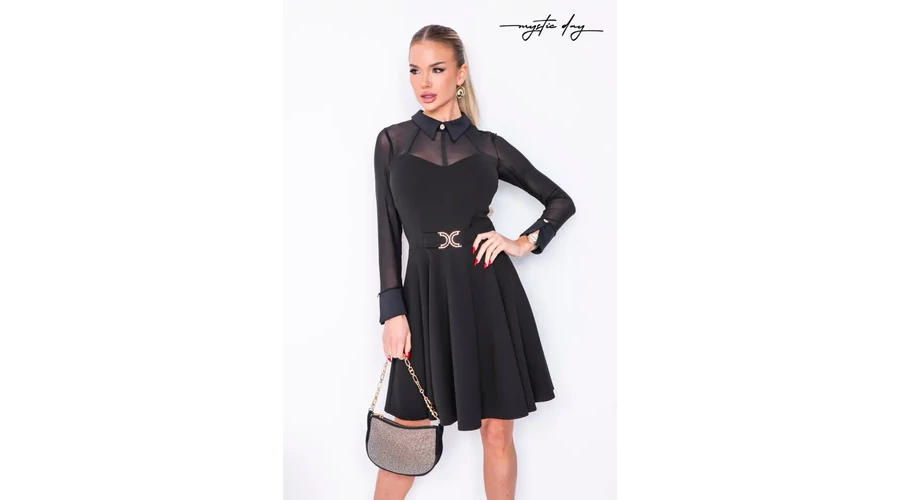 Mystic Day Milánó loknis ruha Elegáns és bájos fekete A-vonalú koktélruha Mellrésznél és a vállaknál áttesztő tüll betét, Szív alakú dekoltázs Elegáns, fekete inggallér, középen gomb díszítéssel Ujjak áttesztő tüll Derekat vékony fekete öv hangsúlyozza Deréktől lefelé bővülő ,lágy esésű ,redőzött szoknyarész |