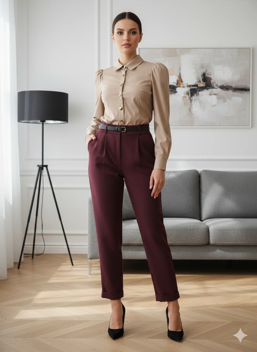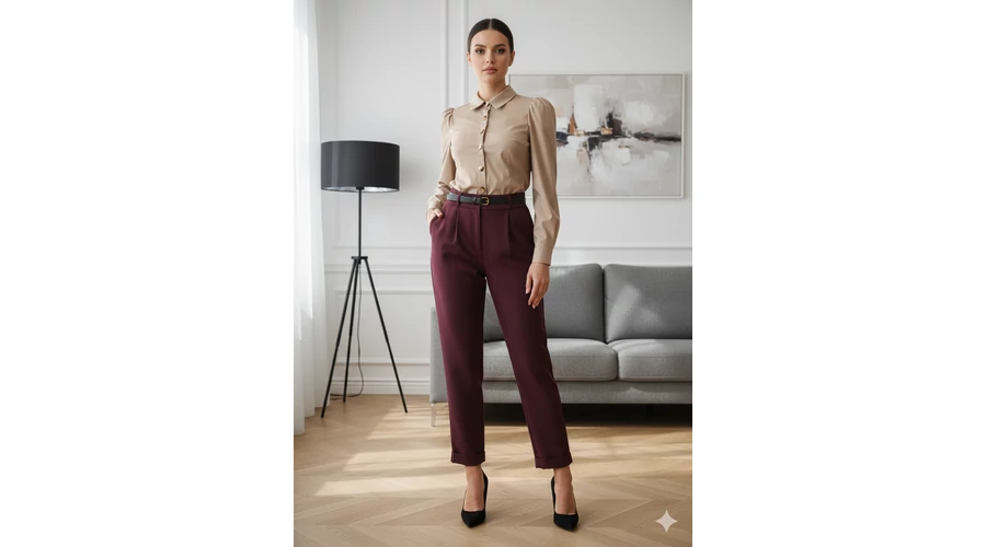 Rouge Avenue Gina nadrág Elegáns, magasított derekú bordó ,női szövetnadrág Zsebes Szűkülő szár Derékrészen hátul gumírozott Derékrészen hajtás Övvel |