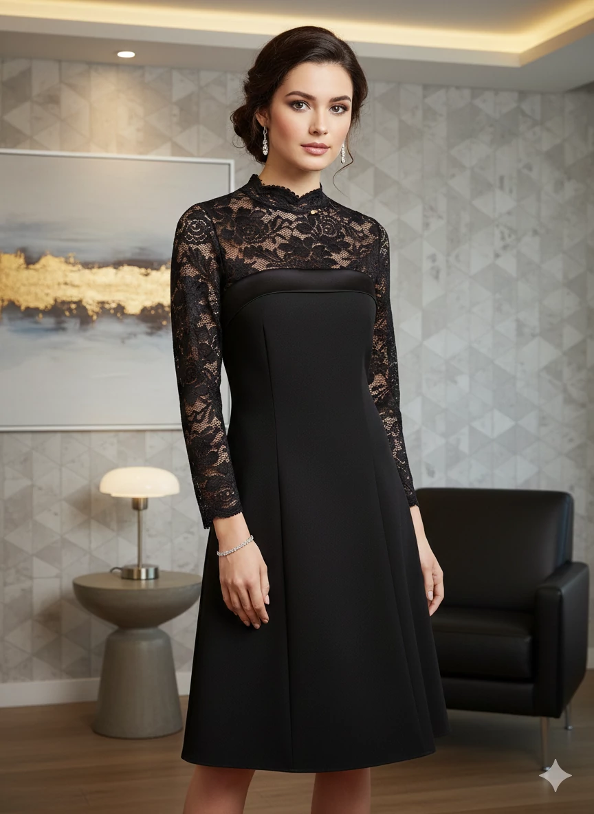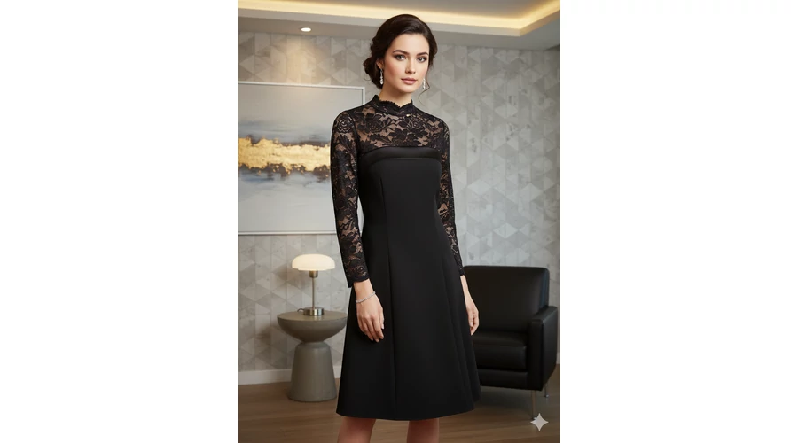 Rouge Avenue Nárcisz ruha Fekete színű Felül csipkés A ruha szoknyarésze enyhén csillogó fekete anyag Enyhén bővülő fazon Hátul cipzáras |